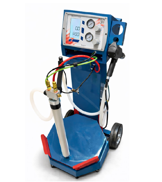 El sistema incorpora una mesa vibradora integrada, sobre la cual se coloca la caja de pintura. La vibración controlada mantiene el material en estado óptimo de fluidez, permitiendo que el sistema de succión extraiga el polvo de forma constante y estable hacia la pistola.